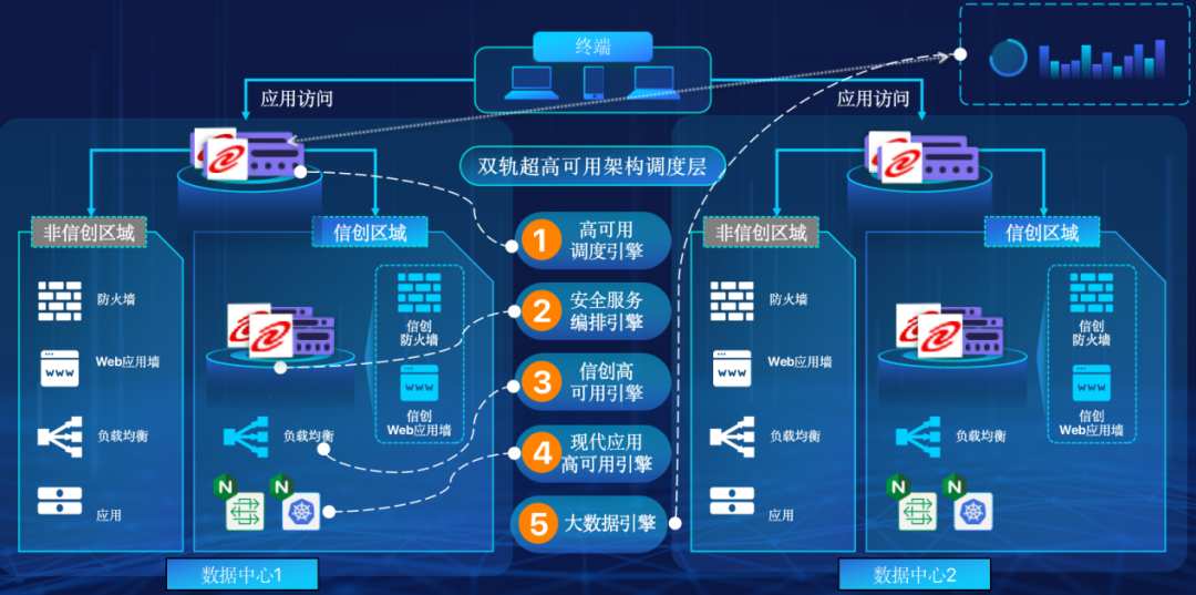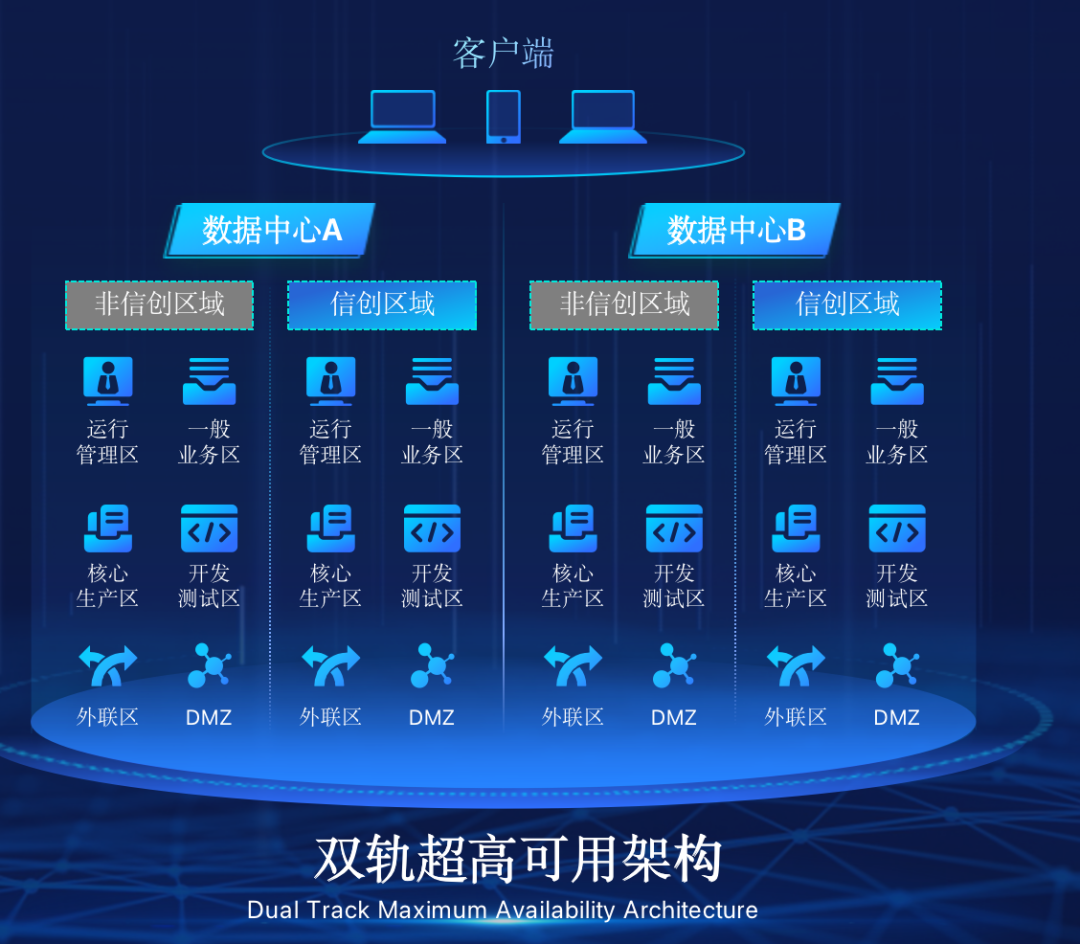 betway必威在企业面临自主创新IT基础重构过程中,推出的全新架构双轨超高可用架构(简称DTMAA),在双活数据中心的分区调度基础上,添加每个数据中心内信创域和非信创域的分域调度,来实现分区分域协同的多活双轨超高可用。