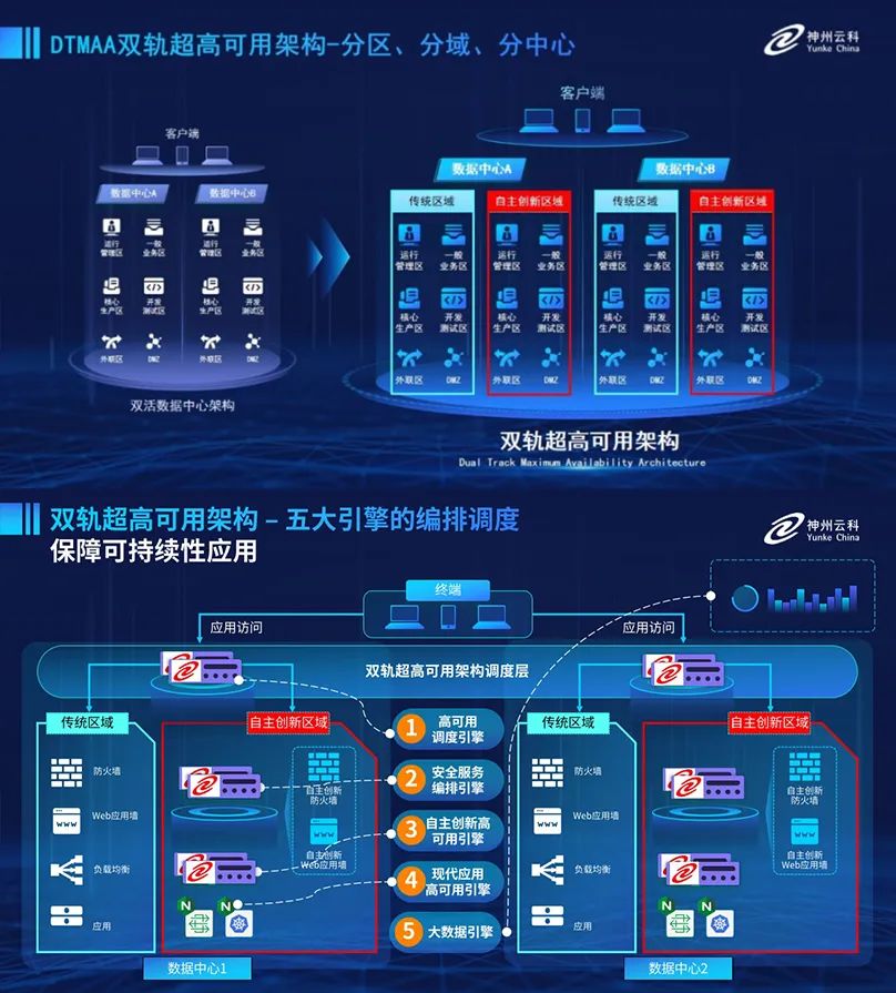 为助力银行业务高质量发展,更好地应对数字经济时代对可持续性的高要求,实现“信创”与“数字化”齐头并进,betway必威创新性的推出了双轨超高可用架构。该架构在双活数据中心的分区调度基础上,增加信创域和非信创域的分域调度,实行信创域与传统域应用全量部署,使双中心运营变为双中心四区域并行运行,互为多活,将“0到1”的单轨建设道路变为分区分域协同的多活双轨超高可用架构。帮助客户在新架构下,保障“信创”的同时解决性能瓶颈,提升稳定性,保证应用可持续性,最终实现信创区域和非信创区域的平滑过渡,完成国产化替代目标。